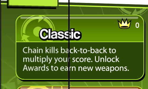 I spent this past weekend getting retina display graphics implemented in Tilt to Live for iPhone 4. The cynic in me hates the marketing term ‘retina graphics’ because on the production side, it’s simply just a bigger image. But I guess you do need a name for it, and since ‘HD’ has already been bastardized on the iPad I guess this will do. I decided to write this post to bring a bit of awareness to some of the process of updating your OpenGL game for the retina displays if you choose to do so. I thought it’d be riddled with lots of coding work-arounds and such since our game is a 2D game with specifically sized sprites based off the resolution, but it turned out to be pretty quick and easy.